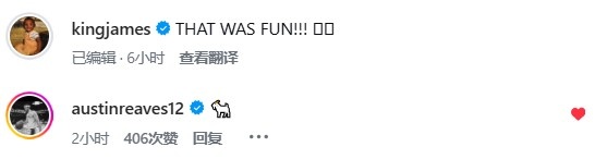詹姆斯早些时候更新了社媒,晒出昨日比赛照片,他配文写道:“太有意思了!!”
